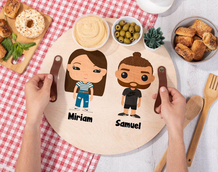 Si eres de esas personas que siempre quieren servir a sus invitados con los mejores productos y bebidas que tienes por casa, esta bandeja de madera personalizada será la clave para dejarles con la boca abierta. ¡Cabrán todas sus bebidas en este producto tan original hecho para los más fans de los productos Tinok! Una bandeja redonda con diseño Tinok como esta le vendrá perfecta para poder llevar todos los aperitivos de esa quedada tan especial a la vez. Esta tabla de madera redonda cuenta con un diámetro de 41,5 centímetros y un asa de cuero de color marrón en cada extremo, para que se pueda llevar con ambas manos. Unos riquísimos donuts, unas aceitunas y unas patatas, vuestro plato de cena favorito... ¡Lo que quieras! Este regalo original está pensado para todas esas personas que adoran los muñecos Tinok. ¡Podrás crear vuestro propio personaje Tinok personalizado en el interior del diseñador! Solo tendrás que añadir esta bandeja al carrito y entrar en el área de personalización. Podrás escoger un muñeco de nuestra familia o crear tu propio personaje en el diseñador. ¡Este aparecerá plasmado en la parte superior de la bandeja! Medida: 41,5 centímetros de diámetro. Material: madera. Importante: Las maderas tienen vetas y estas quedan reflejadas en la imagen.