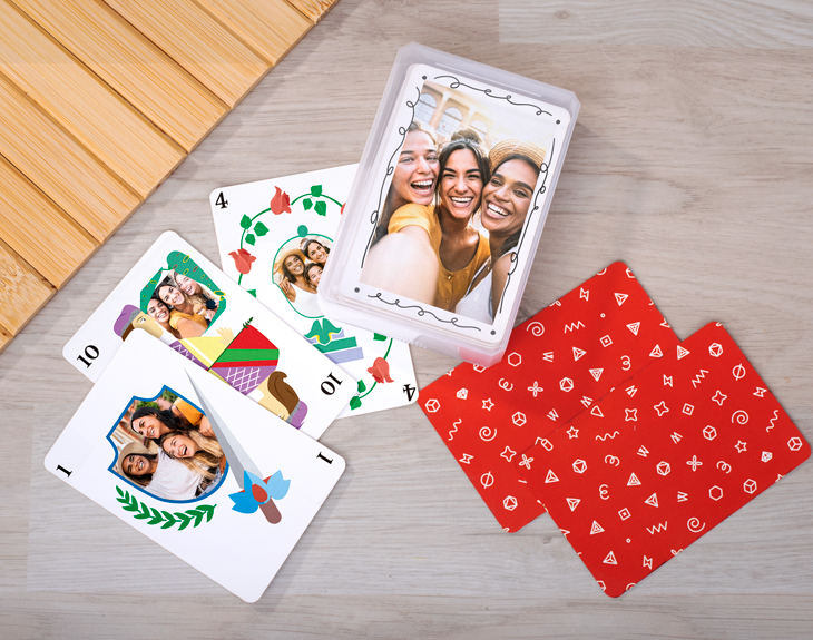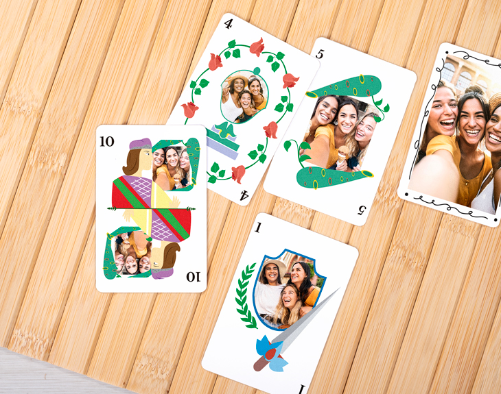 • Baraja española personalizada. • Faldón de cartas personalizado.(opcional) • Tarjeta Recordatoria.