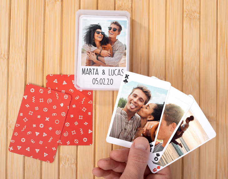 ¿A ti y a tu pareja os encanta disfrutar de una partida de cartas o juegos de mesa? Imagina hacerlo de una manera única y muy especial. ¡Con nuestra baraja de póker personalizada con foto es posible! La clásica baraja francesa, con los tradicionales palos de picas, corazones, diamantes y tréboles, personalizados con la foto que tú elijas. Y, por la parte trasera, un diseño elegante para que el foco esté siempre en el juego. Este regalo es ideal para sorprender a tu pareja en San Valentín, un detalle divertido y original que podréis disfrutar juntos. ¿Y lo mejor de todo? No solo recibirás las cartas, si no que te las enviaremos dentro de una cajita de plástico para que puedas guardarlas y llevarlas donde tú quieras. ¡El regalo perfecto para los amantes de los juegos de naipes! Personalizar esta baraja es muy sencillo. Solo tienes que añadir al carrito la opción que prefieras y entrar en el área de personalización. Desde allí, podrás subir las fotos que elijas para cada palo. ¡Un regalo original para los enamorados! Medidas aproximadas de cada carta: 8,6 x 5,6 cm.