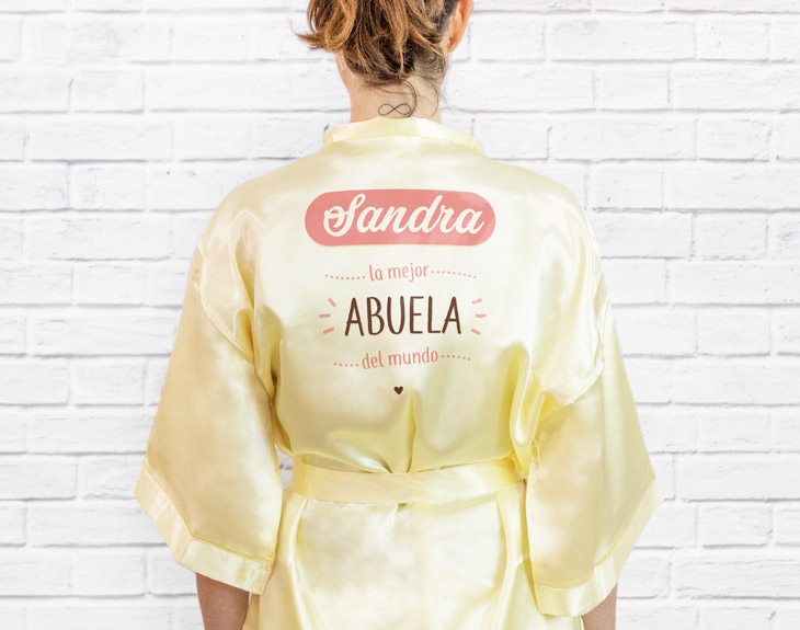 Si tu abuela es la mejor del mundo, ¿no habría que decírselo? Seguro que le encantaría oírtelo decir cada día. Pues ahora puedes hacerlo teniendo con ella un detalle tan bonito como útil. Con esta original bata personalizada, puedes decirle lo mucho que aprecias todo lo que ha hecho por ti con un bonito diseño. ¡Personalízalo con su nombre! Tenga los gustos o edad que tenga, seguro que le encanta este suave tejido de color Champagne. Desde que se levante y se la ponga hasta por la noche cuando tenga más frío, se acordará de su nieto que tanto la quiere. O si no, también puedes utilizarla para agradecerle a tu madre todo lo que te está ayudando con tu hijo. ¡Tú escoges el nombre que quieres grabar! Al estar hecha de poliéster en lugar de rizo, esta bata tan chula es perfecta para el entretiempo. Gracias a su talla única de 61 cm de ancho x 94 cm de alto, te asegurarás de que a tu madre o abuela seguramente les estará muy bien. ¡Para que vayan por la casa también con estilo y con mucho amor!