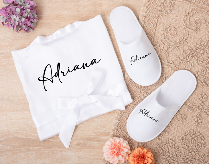 • Bata personalizada. • Zapatillas de estar por casa personalizadas. • Tarjeta Recordatoria.