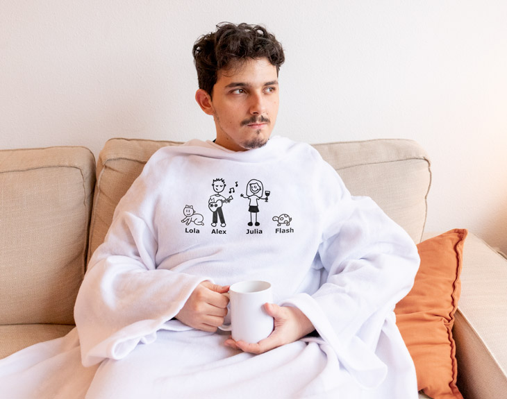 Todo el mundo necesita una batamanta en su vida. Estos increíbles objetos nos dan todo lo que necesitamos, aunando la comodidad de esas imprescindibles batas y el calor que nos produce una buena manta calentita. ¿Acaso hay una mezcla más perfecta? Si eres de esas personas que quiere estar lo más a gusto en su propio hogar, esta batamanta personalizada es el producto que necesitas en tu vida. A todos nos gusta estar tumbados en el sofá, mientras vemos nuestra película favorita, nos acomodamos en nuestra holgazanería. ¿Ya te imaginas tomándote un buen café o un riquísimo té mientras disfrutas de tu procrastinación en el calor de tu casa? Entonces esto es todo lo que necesitas. Además, también es un regalo perfecto para esa persona especial, a la que le apasiona la comodidad y que se considera fans de las batamantas. ¿Quieres hacerle un regalo especial? ¡Esta es tu oportunidad! Puede que esa persona le encante practicar deporte, tocar la guitarra, o leerse una montaña de libros. Si su afición es su vida, entonces esta batamanta es ideal para él. ¡Podras crear tu propia familia Hobbies! Elige el dibujo que mejor se adapte a la vida de esa persona, y este quedará plasmado en la batamanta. ¿Acaso hay un regalo original más chulo? Este producto es de talla única. Material: poliéster. Importante: nuestro equipo de personalización se encargará de ajustar la distribución de los personajes en el producto en función de su tamaño para que se vean lo mejor posible. ¿Qué es una batamanta? Es una prenda de abrigo y cuerpo entero abierta por detrás para estar en casa. Cuenta con las mangas y cuello típicos de una bata para poder llevarla cómodamente sin perder movilidad. Pero además, cuenta con el tacto acolchado y la amplitud de una manta, por lo que puede echarse cómodamente por encima para arroparse en el sofá al tener la zona de la espalda al descubierto y cubrir en profundidad la parte delantera del cuerpo.