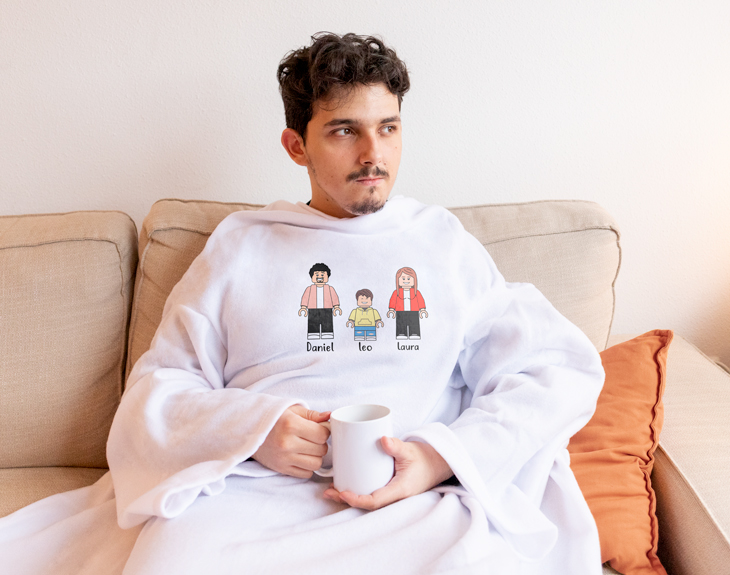 ¿Cuál era tu juguete favorito cuando eras pequeño? ¿Con qué muñecos te pasabas horas jugando? Seguro que la respuesta te ha venido inmediatamente a la cabeza y has recordado toda tu infancia en unos segundos. ¡Qué recuerdos! Había muchos juguetes que molaban y eran súper divertidos, pero... ¿quién no ha jugado alguna vez con los Lego? Era nuestro momento de creernos auténticos arquitectos y crear nuevos mundos y aventuras únicas. Hay muchos Lego: muñecos, construcciones, etc... Por eso, si quieres sorprender a un fanático de Lego y además no quieres que pase frío, tenemos el regalo perfecto. Nuestra batamanta personalizada a la que podrás añadir tus propios muñecos de Lego. ¿Quién no ha querido tener una de estas prendas en casa? Seguro que más de una vez has pensado en hacerte con una porque es todo un acierto en invierno. Pues no te preocupes, porque el día ha llegado: esta batamanta blanca personalizada hará tus sueños más relajantes y tus días de invierno mucho más calentitos. Con ella, podrás pasarte horas jugando con los Lego y no pasar ni una gota de frío. ¡Es el regalo perfecto! Y eso no es todo. Este regalo tiene una sorpresa para ti: ¡podrás personalizar este producto añadiendo hasta ocho muñecos de Lego que podrás crear tú mismo desde cero. Así serán totalmente personalizados y hechos por ti. ¡Pasa un día de lo más relajante y calentito gracias a este detallazo! Este producto es de talla única. Material: poliéster. ¿Qué es una batamanta? Es una prenda de abrigo y cuerpo entero abierta por detrás para estar en casa. Cuenta con las mangas y cuello típicos de una bata para poder llevarla cómodamente sin perder movilidad. Pero además, cuenta con el tacto acolchado y la amplitud de una manta, por lo que puede echarse cómodamente por encima para arroparse en el sofá al tener la zona de la espalda al descubierto y cubrir en profundidad la parte delantera del cuerpo.