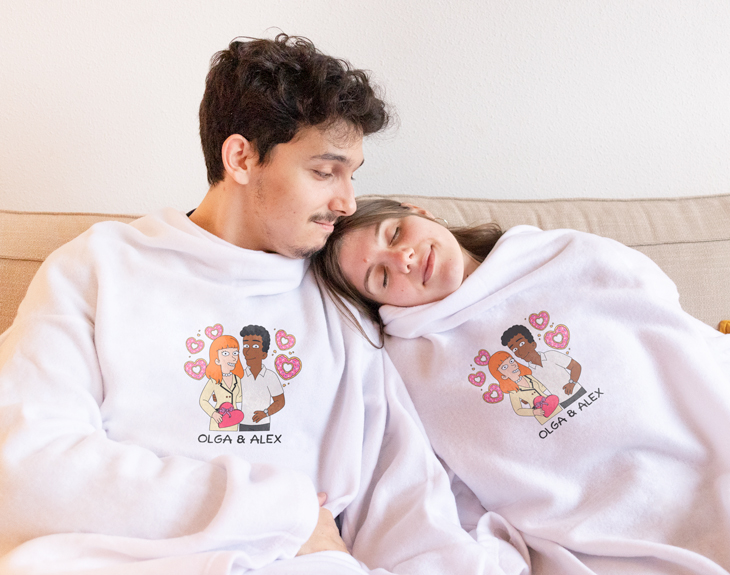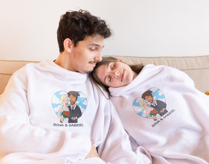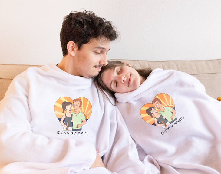 ¿Existe algo mejor que llegar a casa después de un largo día y acurrucarnos con nuestra pareja en el sofá? Está claro que no. Sabemos que hay que estar muy preparados para cuando lleguen las frías noches de invierno, por eso, tenemos esta batamanta personalizada tan chula, ideal para taparse en el sofá y evitar coger resfriados. Es el mejor regalo para celebrar vuestro aniversario o por su cumpleaños. ¡Le dejará sin palabras! Uno de los planes para cuando llega el frío, sin duda, es un maratón de pelis en el sofá, al lado de tu persona favorita. Imagina estar viendo una peli con tu pareja en el sofá, y los dos bien arropaditos con estas batamantas tan cómodas. ¡Sería increíble! Pero está claro, que lo mejor que tienen es el diseño Cartoon personalizable, tú diseñas vuestros propios personajes. ¡Seréis la pareja del año de vuestra serie de animación! Y te preguntarás… ¿Cómo se personaliza esta batamanta? El primer paso a seguir es añadir el producto al carrito y entrar al área de personalización. Una vez dentro del diseñador, podrás crear a tus avatares desde cero. Tienes un montón de rasgos y accesorios distintos, seguro que encuentras los que os representen. ropa, etc. ¡Puedes ponerle un fondo bonito o romántico a estos personajes! Material: poliéster. ¿Qué es una batamanta? Es una prenda de abrigo y cuerpo entero abierta por detrás para estar en casa. Cuenta con las mangas y cuello típicos de una bata para poder llevarla cómodamente sin perder movilidad. Pero además, cuenta con el tacto acolchado y la amplitud de una manta, por lo que puede echarse cómodamente por encima para arroparse en el sofá al tener la zona de la espalda al descubierto y cubrir en profundidad la parte delantera del cuerpo.