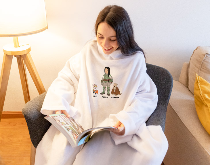 Los Jedis pueden hacer increíbles habilidades, pero hay una que las supera a todas: poder utilizar el móvil a la vez que estás arropado hasta el cuello. No necesitarás aprender a utilizar la fuerza para poder hacerlo. Tan solo tendrás que añadir al carrito esta batamanta personalizada. Ideal para todas esas tardes de sofá y película, para que puedas comer y beber cómodamente mientras ves el maratón de toda la saga Star Wars. ¡Sin pasar nada de frío! Sorprende a tus amigos más frikis con el mejor regalo original para fans galácticos. Seguro que siempre han soñado con ser pilotos de la Alianza Rebelde o hasta se han hecho cosplays con el Beskar de los mandalorianos. Haz que se sientan como sus personajes favoritos entre los más de 3.000 muñecos disponibles. ¡Personaliza cada uno con el nombre que quieras! Crea tu familia estelar con esta batamanta de Star Wars: tendrás a escoger tanto hombres y mujeres como niñas y niños, e incluso mascotas jedi. Este producto es de talla única. Material: poliéster. Importante: a partir de 6 personajes. se colocarán en dos filas. Es decir: - Familia de 6 personajes: 3 en la fila superior, y 3 en la inferior. - Familia de 7 personajes: 4 en la fila superior, y 3 en la inferior. - Familia de 8 personajes: 4 en la fila superior, y 4 en la inferior. ¿Qué es una batamanta? Es una prenda de abrigo y cuerpo entero abierta por detrás para estar en casa. Cuenta con las mangas y cuello típicos de una bata para poder llevarla cómodamente sin perder movilidad. Pero además, cuenta con el tacto acolchado y la amplitud de una manta, por lo que puede echarse cómodamente por encima para arroparse en el sofá al tener la zona de la espalda al descubierto y cubrir en profundidad la parte delantera del cuerpo.