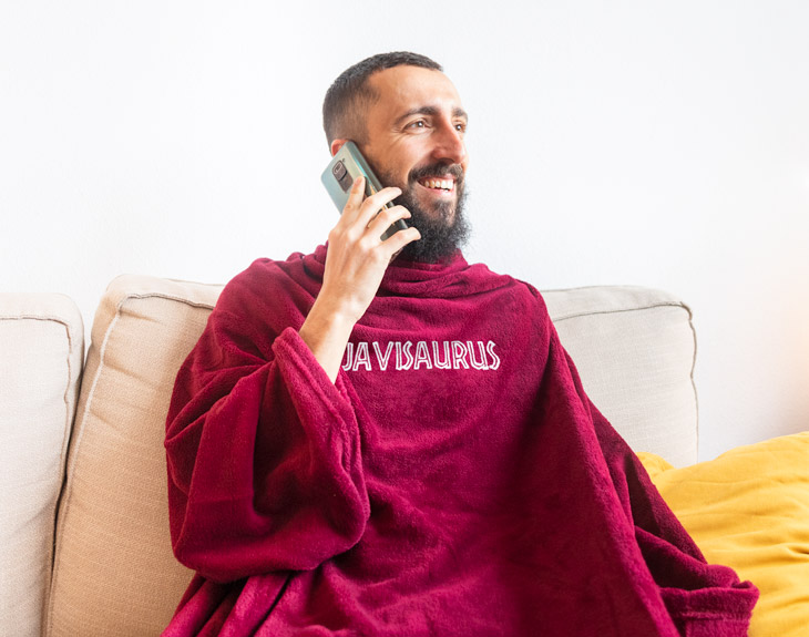 Imagina que estás viendo tu película favorita en la tele, tumbado en el sofá, bien arropado hasta el cuello. Y de repente, te llaman por teléfono o tienes que coger el mando para subir el volumen. ¡Qué incómodo es tener que bajarte la manta hasta la cintura para moverte y coger cosas! Olvídate de estos inconvenientes y de pasar frío con esta batamanta personalizada. Así te mantendrás bien abrigado hasta el cuello y podrás seguir usando los brazos. Esta batamanta 100% de poliéster es tan cómoda y grande que todo el mundo querrá usarla. ¡Graba tu nombre sobre ella para que todo el mundo sepa de quién es! Añade el producto al carrito y escribe el texto que quieras. Y para que sea un regalo original para los más frikis y fans de los dinosaurios, tendrás la famosa tipografía de las películas de 'Parque Jurásico'. Siéntete como un protagonista de la famosa saga creada por Steven Spielberg con esta batamanta personalizada. ¡Para que te puedas hacer un maratón de 'Jurassic Park' y 'Jurassic World' sin ninguna molestia ni frío! Este producto es de talla única. Material: poliéster. ¿Qué es una batamanta? Es una prenda de abrigo y cuerpo entero abierta por detrás para estar en casa. Cuenta con las mangas y cuello típicos de una bata para poder llevarla cómodamente sin perder movilidad. Pero además, cuenta con el tacto acolchado y la amplitud de una manta, por lo que puede echarse cómodamente por encima para arroparse en el sofá al tener la zona de la espalda al descubierto y cubrir en profundidad la parte delantera del cuerpo.