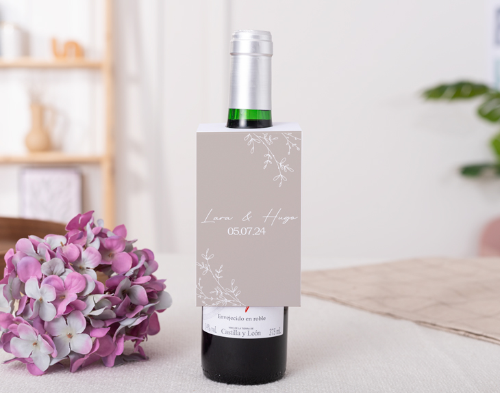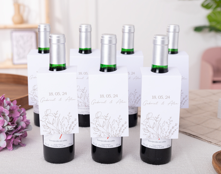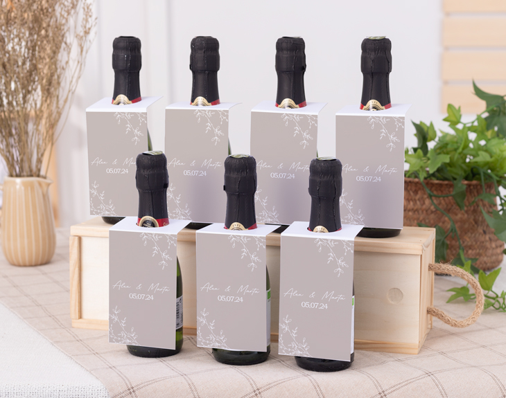 ¡Todas las bodas son súper especiales! Ese día en el que la pareja se dice el 'Sí quiero' y se comprometen a pasar su vida juntos, son maravillosas. Si quieres sorprender a los invitados de tu boda, tenemos el detalle perfecto. Se trata de nuestros benjamines de vino o cava personalizados con diseño "Amor silvestre". Sin duda, con estas botellitas tus invitados tendrán un recuerdo inolvidable de ese día tan especial. Podéis elegir entre regalar mini botellas de cava o de vino. ¡Lo que más os guste! Y mejor de estos benjamines es que son personalizables, podéis escribir vuestros nombres y la fecha de este día. ¡Quedará genial! Personalizar este benjamín de cava o vino es muy sencillo. El primer paso a seguir consiste en añadir el producto al carrito y entrar al área de personalización. Una vez ahí, ya puedes escribir vuestros nombres junto con la fecha de vuestra boda y el lugar. Pronto estará perfecto y listo para regalar. ¡Será un regalo original para bodas!