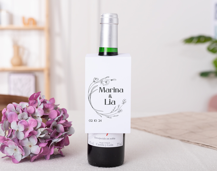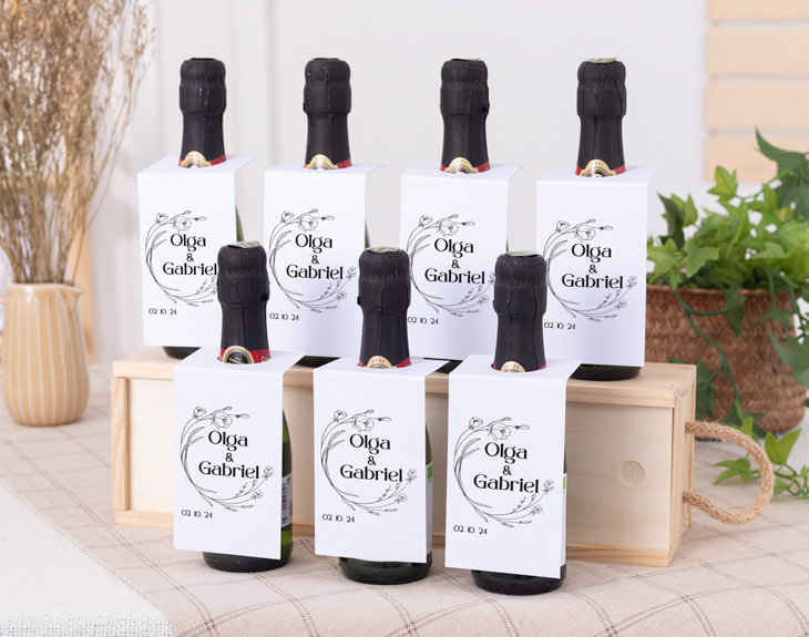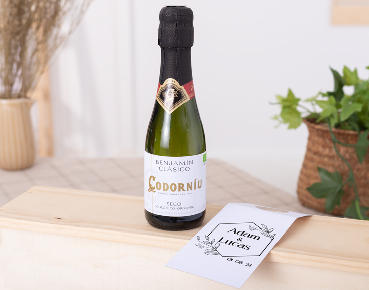 Una boda es un día súper especial, están hechas para celebrar el amor por todo lo alto con todos los seres queridos. ¡Son preciosas! Si este año es vuestro momento y vais a dar el gran paso, tenemos algo que no os puede pasar. Se trata de nuestros benjamines de cava o vino personalizados con diseño "Flores de amor". Son ideales para sorprender a los invitados de tu boda. Gracias a estas mini botellas, el día de tu boda se convertirá en un recuerdo inolvidable. Podéis elegir entre regalar unos benjamines de vino o de cava. Y además, lo mejor que tienen es que son personalizables, podrás escribir vuestros nombres junto con la fecha de este día tan especial. ¡Quedará genial! Personalizar este benjamín de cava o vino es muy sencillo. El primer paso a seguir consiste en añadir el producto al carrito y entrar al área de personalización. Una vez ahí, ya puedes escribir vuestros nombres junto con la fecha de vuestra boda y el lugar. Pronto estará perfecto y listo para regalar. ¡Será un regalo original para bodas!