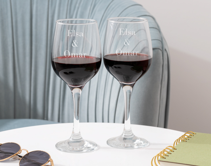 • 2 copas de vino grabadas (Capacidad de 372cc). • Vino Azpilicueta. Rioja Crianza o Mozares Vaerdejo (Denominación de Origen Rueda)(opcional). • Tarjeta Recordatoria.