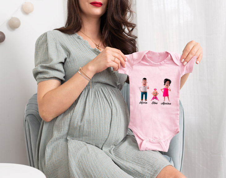 Un body de bebé de algodón con manga corta de punto liso, cuello redondo y bajo ribeteado en canalé 1x1. Cuenta con un cierre con botones a presión en la entrepierna. Diséñalo eligiendo muñecos de un catálogo de 56 personajes. ¡Un regalo precioso para tu bebé! Importante: a partir de 6 personajes, se distribuirán en dos filas. Es decir: - Familia de 6 personajes: 3 en la fila superior, y 3 en la inferior. - Familia de 7 personajes: 4 en la fila superior, y 3 en la inferior. - Familia de 8 personajes: 4 en la fila superior, y 4 en la inferior.