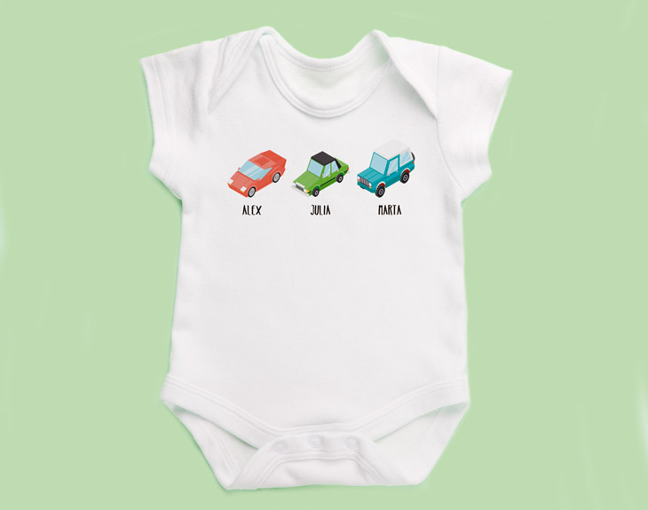 • Body personalizado. • Tarjeta recordatoria. ¿Te apasiona el mundo del motor? ¿Tienes un coche al que adoras? ¿En tu barrio todos te conoce como “el motorista”? Para ti hemos creado una extensísima variedad de regalos originales entre los que se encuentra nuestro body personalizado Familia Coches. Un regalo único y especial, y con el que lo pasarás genial diseñándolo. Los bodys están fabricados en tela de algodón muy suave, perfecta para la delicada piel de los bebes. Son de manga corta y cuentan con varias tallas, desde los 3 meses hasta los 18 meses. Disponen de un cuello tipo americano para facilitar la tarea del cambio de ropa y de corchetes en la parte inferior para cambiar el pañal sin desvestir al bebé. En cuanto a la personalización, al hacer el pedido accederéis al catálogo de personajes de nuestra familia Coches. En ella, podréis escoger todo tipo de vehículos, desde Scooters hasta caravanas en varios colores. La idea es que cada miembro de la familia escoja el vehículo con el que se siente más identificado y así completar vuestra propia familia sobre ruedas. Para completar el diseño, tendréis la opción de anotar el nombre de cada miembro de la familia debajo del personaje escogido. ¡Solo quedará esperar a recibir tu flamante regalo cómodamente en casa!