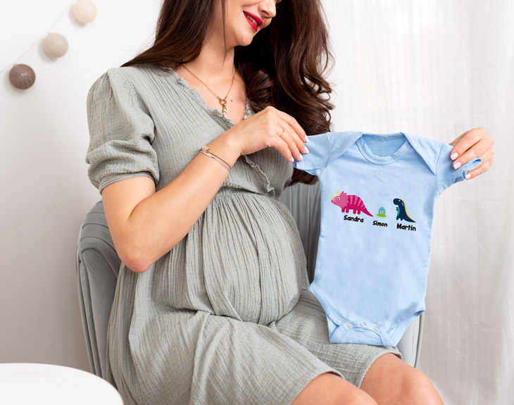 • Body personalizado. • Tarjeta recordatoria. En cuanto empiezan a interactuar con su entorno, los niños se sienten automáticamente atraídos hacia los dinosaurios. No sabemos si será por sus dientes, por su enorme tamaño o por el hecho de que parecen casi animales de fantasía, pero, sea como sea, siempre acaban convirtiéndose en su juguete favorito. Por eso, entre nuestros productos no podía faltar un diseño inspirado en el mundo de los dinosaurios, con el que los niños estarán encantados. Nuestros bodys están fabricados en suave tela de algodón y son de manga corta. Puedes escogerlos desde la talla más pequeña (3 meses) para bebés recién nacidos, hasta la talla más grande de 18 meses. Al hacer el pedido, podrás también escoger el color de body que te guste más para tu regalo. En cuanto a sus características, el body incluye corchetes en la zona del pañal y un cuello tipo americano para que el cambio del bebé sea más cómodo. Para la personalización del regalo el proceso es muy sencillo. Solo tienes que acceder al catálogo de dinosaurios y escoger uno a uno cada personaje en el orden que desees. A medida que incluyas personajes, puedes anotar el nombre de cada miembro de la familia debajo del dinosaurio que le corresponda. Optar por un body personalizado como regalo es una de las opciones más prácticas y bonitas para los bebés más pequeños. A sus papás les ayudarás a completar el vestuario del bebé de una forma original y tú quedarás genial con el detalle.