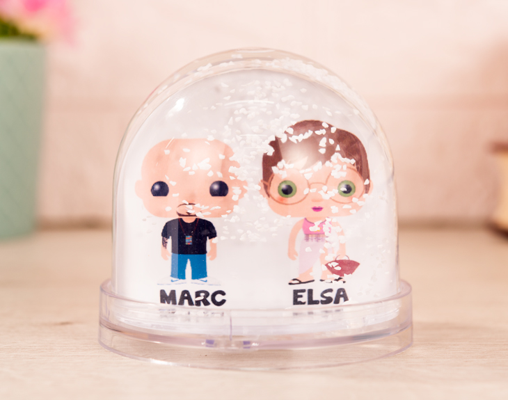 Una casa tiene que ser decorada con toda la personalidad de sus dueños. Nuestra vida y nuestra relación de pareja está formada por pequeños detalles que hacen que nos emocionemos cada vez que recordamos ese instante tan especial. ¿Tu amorcito y tú sois unos fanáticos de los Tinoks? Esta bola de nieve personalizada está pensada para decorar vuestro salón con un objeto que represente vuestro amor. Y es que esta bola de nieve con diseño Tinok quedará de lo más romántica en cualquier rincón de la casa... ¡Será un regalo de lo más sorprendente! Esta bola de nieve tiene una altura de 8,5 centímetros y un diámetro de 9 centímetros. Además, la cubierta hecha de plástico transparente hace que sea de lo más resistente. ¿Te imaginas crear un regalo original que contenga un diseño Tinok de vosotros mismos? Podrás crear vuestros personajes gracias a nuestro diseñador, en el que podrás escoger uno de nuestros muñecos predeterminados (¡elige entre más de 400 personajes!) o diseñar tu propia figura. Contamos con diferentes peinados y ropas entre los que elegir a la hora de crearos a vosotros mismos. ¡Estos personajes irán en el interior de la bola de nieve!