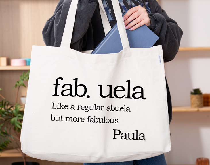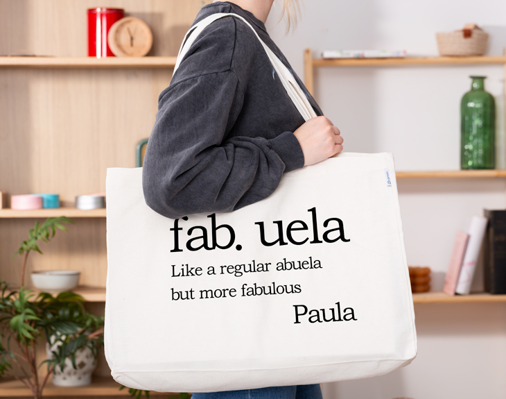 ¡El verano ya ha llegado! Si todavía te acuerdas de esos veranos yendo a la playa con tu abuelita, tenemos algo que te va a encantar. Se trata de nuestro bolso de playa personalizado con diseño "Fab-uela". Es un original regalo para sorprender a la mejor abuela del mundo, le recordará a esas tardes enteras en la playa jugando a las cartas o con la arena. Es una preciosa forma de demostrarle lo mucho que valoras todos esos buenos momentos con ella. Además, esta bolsa es perfecta para guardar los bikinis, la toalla, un libro... ¡Todo lo necesario para pasar un día de playa increíble! Y lo mejor de este bolso es que es personalizable, podrás escribir el nombre de la abuela más fabulosa de todas. Personalizar este bolso de playa es muy sencillo. El primer paso a seguir consiste en añadir el producto al carrito y entrar al área de personalización. Una vez ahí, ya puedes escribir el nombre tu abuela. Pronto estará perfecto y listo para regalar. ¡Será un original regalo para abuelas! Dimensiones: 50 de largo x 36cm de alto x 13cm de ancho. Gramaje: 280 g/m². Material: algodón (50%), algodón reciclado (30%) y poliéster reciclado (205).