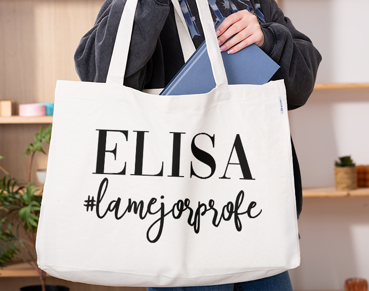 Queda muy poco para poder disfrutar de la mejor época del año: ¡el verano! Y sin duda quienes más ganas tienen de vacaciones son los profes. Por eso, fin de curso es el momento perfecto para sorprenderles con un regalo único, nuestra bolsa beige de playa personalizada. Se convertirá en su accesorio favorito porque podrá guardar en ella todo lo que quiera, ya que tiene el tamaño ideal para cualquier plan. Si queréis dejar sin palabras a vuestro profe favorito, este original regalo es ideal. Nuestra bolsa beige de algodón reciclado es el accesorio perfecto tanto para verano como para el resto del año, aunque tiene el tamaño perfecto para guardar un montón de cosas y pasar el día fuera de casa. ¡Es lo más! La mejor parte de este regalo es poder personalizar esta bolsa a tu gusto y como sabemos que las redes sociales están a la orden del día, este diseño no iba a ser menos. Añade el producto al carrito y personaliza nuestro diseño 'Hashtag' con el nombre y frase que quieras. Podrás hacerlo igual que la imagen o dejar volar tu imaginación. ¡Tendrás el mejor regalo del mundo! Dimensiones: 50 cm de largo x 36 cm de alto x 13 cm de ancho. Gramaje: 280 g/m². Material: algodón (50%), algodón reciclado (30%) y poliéster reciclado (205).