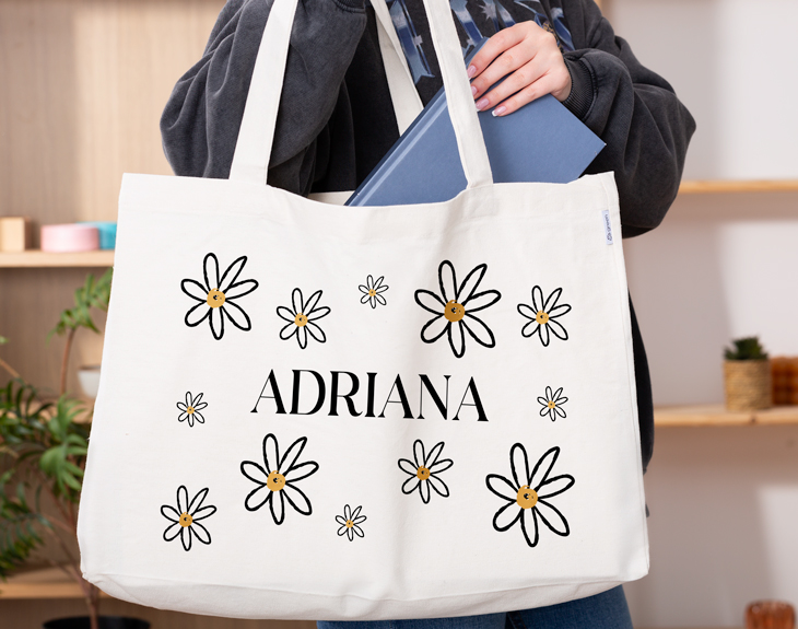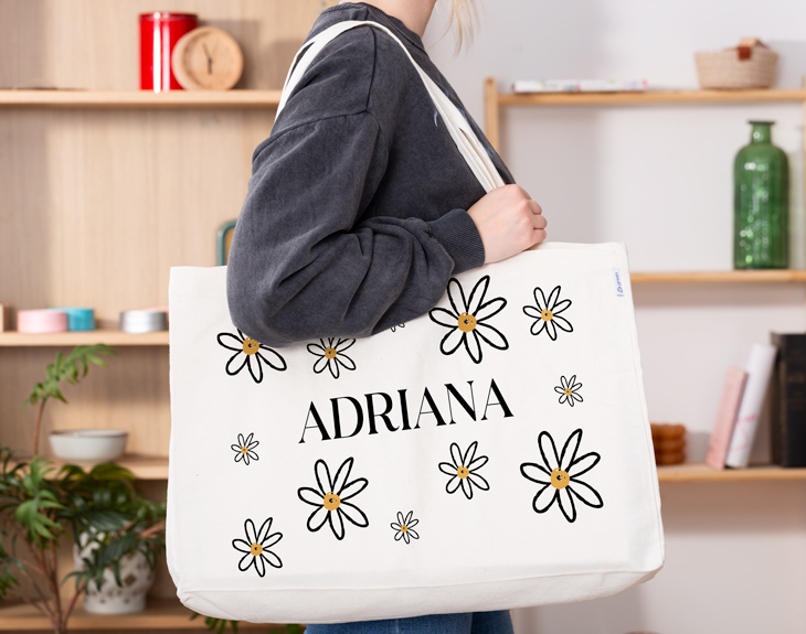 ¿Has empezado ya la cuenta atrás para las vacaciones? Seguro que ahora tienes mucho que preparar y, si vas a la playa, te harán falta un montón de complementos para que puedas disfrutar al máximo del sol y del calorcito. Con nuestra bolsa beige de playa personalizada Margaritas podrás llevar todo de golpe y sin perder ese toque especial que tanto te gusta. Esta práctica bolsa está fabricada en una mezcla de tela de algodón y poliéster de lo más resistente porque, al fin y al cabo, ¡Nos llevamos casi la casa a cuestas cuando pasamos el día fuera! Esta bolsa gigante personalizada aguantará perfectamente tu ritmo y, gracias a sus largas asas, podrás ir a todas partes con ella con total comodidad. Pero lo mejor, sin duda, es su divertido estampado de margaritas y la posibilidad de personalizar con tu nombre el diseño. Coloca el nombre en la plantilla de diseño de nuestra web y nosotros nos encargamos del resto. Por tu parte, solo tienes que prepararte para recibir en casa el bolso de playa que será la envidia del verano. Este bolso de playa es genial como autorregalo pero también es una opción excelente cuando buscamos un regalo original con el que sorprender a esa personita especial. Si le encanta pasar el día en la playa, ¡No lo dudes! No encontrarás regalo más práctico y especial para ella. Dimensiones: 50 cm de largo x 36 cm de alto x 13 cm de ancho. Gramaje: 280 g/m². Material: algodón (50%), algodón reciclado (30%) y poliéster reciclado (205).