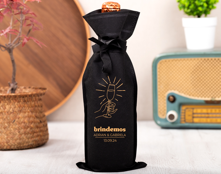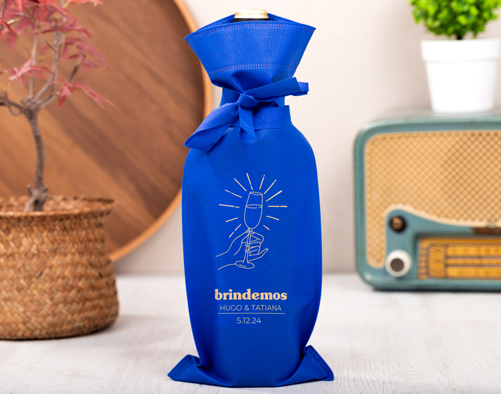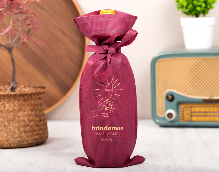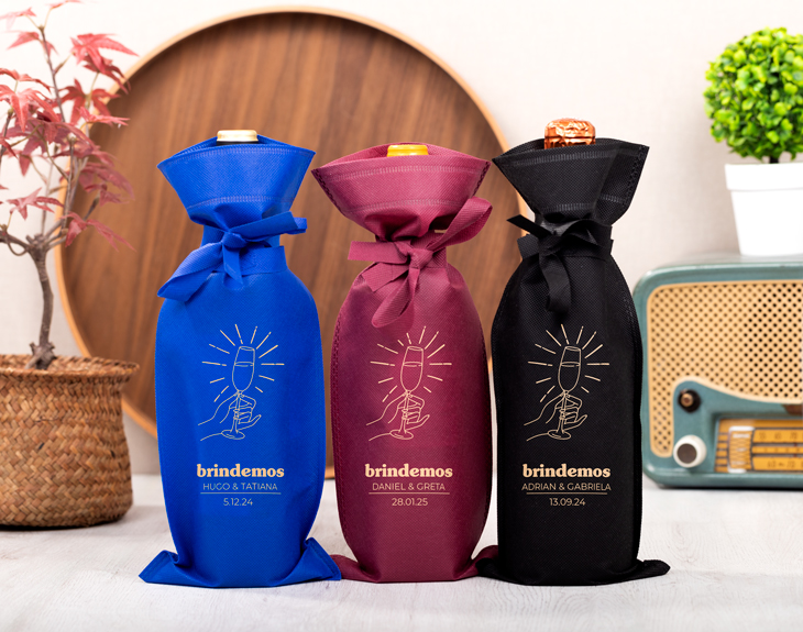 ¿Queréis sorprender a todos los invitados el día de vuestra boda? ¿Necesitáis un detalle original y diferente? No os preocupéis porque tenemos algo para dejar a todos con la boca abierta y son estas bolsa para botellas de vino personalizadas. Sin duda, será un detalle súper guay para todas esas personas que tanto queréis y que os han acompañado el día más importante de vuestra vida. A todo el mundo le gusta disfrutar de una buena copa de vino, por eso, este original regalo para invitados es lo más. Podrás elegir el color que más te guste para la bolsa y personalizar el diseño como tú quieras. Y también tendrás dos opciones para elegir: si quieres solo la bolsa o prefieres regalar la bolsita con una botella de vino. Además, podrás elegir la cantidad que quieras. ¡Es lo más! Para poder personalizar estas bolsitas, primero tienes que añadir las unidades que quieras al carrito. En ese punto puedes decidir si quieres personalizarlas todas iguales o cada una de forma diferente. Cuando entres al diseñador, solo tendrás que completar el precioso diseño que te dejamos con el texto que quieras y listo. Es súper fácil. ¡Será el mejor regalo de invitados del mundo!
