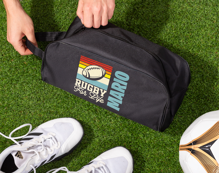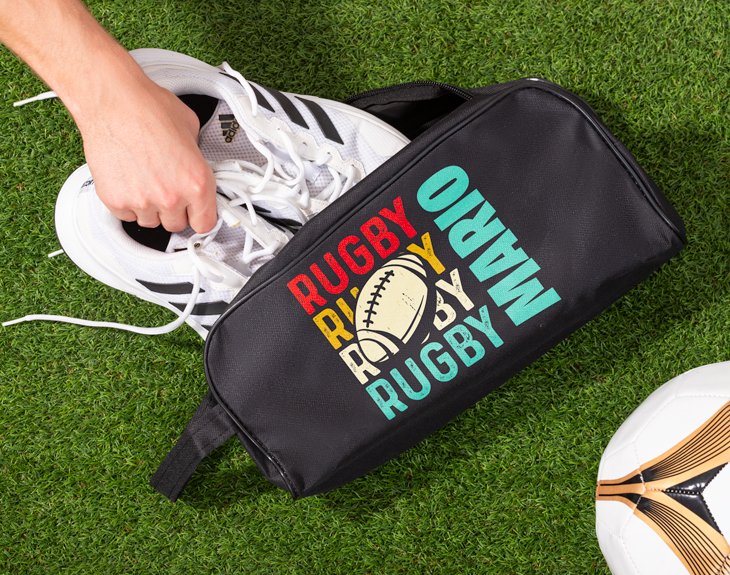 ¿Cuál es tu deporte favorito? ¿El fútbol, el baloncesto, tenis, pádel...? Si tú eres más de rugby, está claro que nuestra bolsa para zapatillas personalizada con diseño "Rugby" te vendrá de maravilla. Es perfecta para guardar las zapatillas de deporte de manera cómoda. ¡Muy práctica para llevarla a todos los entrenamientos y partidos! Además, esta bolsa para zapatillas también se puede convertir en un original regalo para esa persona que adora hacer deporte y que su gran pasión en el rugby. ¡Le encantará! Lo mejor que tiene es que es personalizable, podrás escribir el nombre de esa persona súper deportista. Solo queda personalizar esta bolsa para zapatillas, es súper sencillo. El primer paso a seguir consiste en añadir el producto al carrito y entrar al área de personalización. Una vez ahí, ya puedes escribir el nombre que tú quieras. Pronto estará perfecta y lista para regalar. ¡Será un original regalo para deportistas! Medidas: 34,5 x 16 x 14 cm.