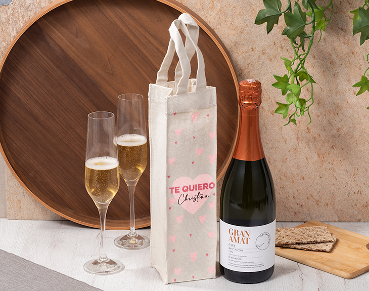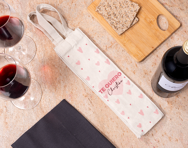 Nosotros somos de los que pensamos que no hay nada más bonito para una cita que una cena romántica en casa. Preparar la cena favorita de tu pareja, incluir unas velas para crear un ambiente amoroso e íntimo... ¡Y disfrutar de una buena copa de vino o cava! Si ambos sois fanáticos de los vinos y os encanta llevar uno en cada ocasión especial, esta bolsa de tela personalizada será el detalle que estabas buscando. Si tu amorcito no puede dejar de probar diferentes tipos de vino o cava, esta bolsa para botella con diseño romántico es el producto perfecto para esta ocasión especial. Esta bolsa está hecha de tela, y cuenta con una altura perfecta para cubrir entera la botella: 41 centímetros incluyendo las asas. ¡Es perfecta para guardar vuestra botella favorita! ¿Y qué mejor manera de hacerlo que con un regalo original que le deje con la boca abierta? Declárate a esa personita que tanto quieres con este diseño, hecho especialmente para los más románticos. Una vez entres en el portal de personalización solo tendrás que escoger el color que quieras para tu diseño. Después encontrarás la plantilla... ¡Solo tendrás que escribir el nombre del amor de tu vida! Y además, podrás escoger si quieres la bolsa únicamente, o si prefieres crear el pack completo, añadiendo la botella de vino o cava. Medidas: 41 x 9 centímetros.