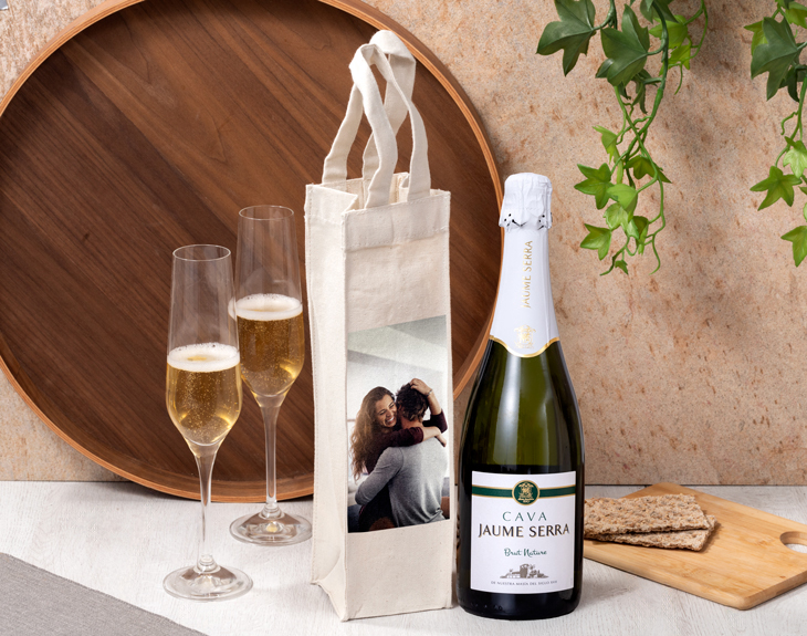 • Bolsa de tela para vino personalizada. • Botella de cava Jaume Serra. • Tarjeta Recordatoria.