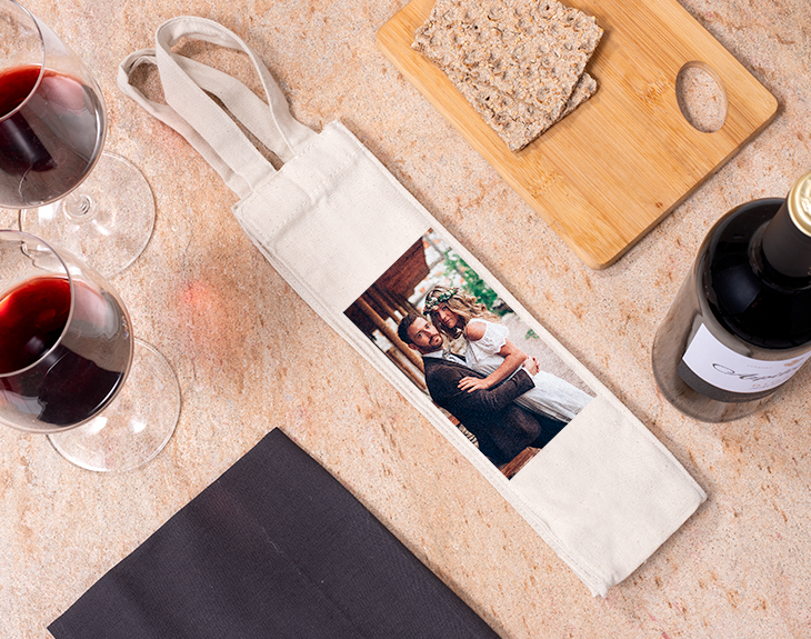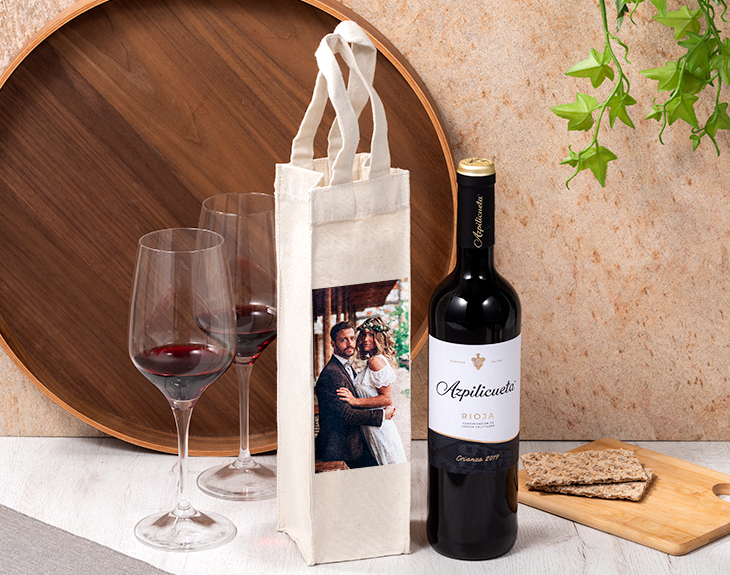 Cada vez que nos juntamos con nuestros seres queridos hay una cosa que no puede faltar: vuestra bebida favorita. Independientemente de si eres más de vino o si prefieres la elegancia del cava, tomarse una copa rodeado de nuestros familiares y amigos es siempre un buen plan. Para ello contamos con esta bolsa de tela personalizada. ¡Podrás llevar tu botella preferida a cualquier lugar! Esta bolsa para botella de vino o cava con foto está hecha para todas esas personas que disfrutan del sabor de esta clase de bebidas al máximo. ¡Una fiesta no es nada sin alguna de estas dos cosas! Este producto tiene una altura de 41 centímetros y cada uno de sus lados mide 9 centímetros. ¡Cualquiera de las dos botellas cabrá a la perfección! Este regalo original podrá completarse con la botella que prefieras: vino Azpilicueta o cava Gran Amat. Una vez hayas escogido el producto que quieras para tu regalo, solo tendrás que entrar en el diseñador y personalizar la bolsa. Solo tendrás que subir la imagen que quieras al sistema y añadirla a la plantilla. ¡Nosotros nos ocuparemos de plasmarla en esta bolsa! Medidas: 41 x 9 centímetros.