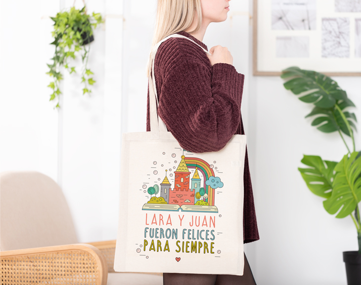 Sorprende a tu pareja declarándole todo tu amor con esta preciosa bolsa tote personalizada. Si buscas un detalle especial para vuestro aniversario, su cumpleaños o simplemente alegrarle el día a día, este regalo original te ayudará a decirle lo mucho que te importa. En esta bolsa de tela, los dos sois los protagonistas de la mayor historia de amor jamás contada: ¡la vuestra! Para ello, puedes personalizar la totebag con vuestros nombres y el color de fondo que escojas. Además de llevarte siempre consigo, tu pareja podrá llevar en esta bolsa tote todo lo que necesite para el trabajo, el gimnasio o para las citas que tengáis en el campo o la playa. ¡Haz tus momentos y tus fotos más especiales, como salidos de una película!