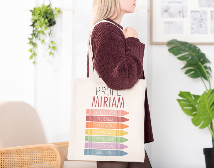 Un buen profe tiene que tener muchas cualidades, entre las cuales la paciencia es fundamental, que sea inteligente, creativo, dedicación... y un montón más. Si vuestra profe cumple con todas y con más, está claro que se merece un detalle a su altura. Y nuestra bolsa tote personalizada con diseño "Crayones del profe" es el regalo perfecto para sorprenderla en fin de curso, le encantará. Esta bolsa de tela es ideal para guardar todas las cosas necesarias en el día a día, para hacer la compra o incluso, ahora que llega el buen tiempo, puede ser perfecta para llevarla a la piscina o la playa. Y es que lo mejor es que es personalizable, podrás escribir el nombre de la mejor profe del mundo. Personalizar esta bolsa tote es muy sencillo. El primer paso a seguir consiste en añadir el producto al carrito y entrar al área de personalización. Una vez ahí, ya puedes escribir el nombre que quieras. Pronto estará perfecta y lista para regalar. ¡Será un original regalo para profes!