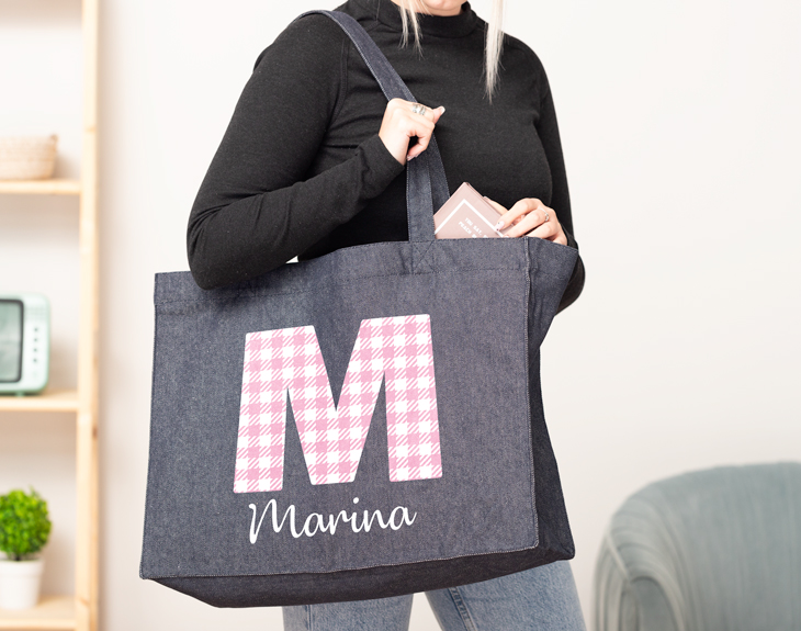 Si eres una persona que está todo el día de un lado para otro y apenas pasas por casa, está claro que necesitas nuestra bolsa tote denim con diseño "Alfabeto Vichy". Es ideal para que puedas guardar todo lo que vayas a necesitar y que no te falte de nada. ¡Es genial porque cabe de todo! Y si estás pensando en sorprender a esa persona tan especial, sin duda, esta bolsa vaquera se convertirá en un regalo súper original. Cuenta con un estampado chulísimo, ¿quién no conoce los míticos estampados Vichy? Estos clásicos cuadrados de color son el diseño perfecto para esta bolsa personalizada. ¡Son como lo de los típicos manteles italianos! Personalizar esta bolsa tote denim es súper sencillo. El primer paso a seguir consiste en añadir el producto al carrito y entrar al área de personalización. Una vez ahí, ya puedes escribir el nombre que tú quieras. Pronto estará perfecta y lista para regalar. ¡Será un original regalo! Especificaciones: - Altura: 68 centímetros (con asas incluidas) y 37 centímetros (sin asas incluidas). - Largo: 48 cm. - Material: 70% algodón reciclado / 30% poliéster reciclado.
