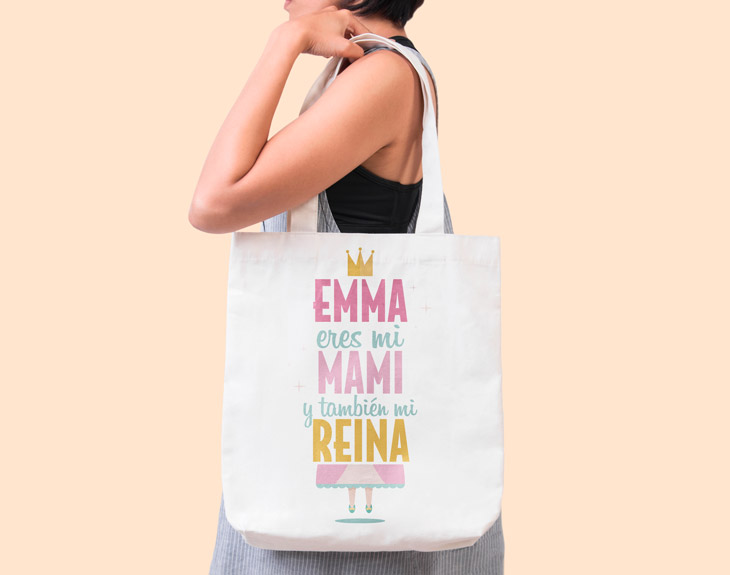 Piensa en lo cariñosa que ha sido tu madre contigo pero también en todo lo que te ha ayudado y guiado. Por ello, aparte de ser tu querida mami, ¡también es tu reina! Agradéceselo y devuélvele todo el cariño que ella te ha dado con este fantástico regalo tan original como divertido. En nuestra bolsa tote personalizada, podrás inscribir su nombre junto al precioso mensaje de amor que le llenará de ilusión. Podrías hacerle miles de regalos, pero ninguno será tan útil como este. En su día a día, cada vez que vaya a trabajar, al gimnasio, a hacer la compra... se acordará de por quién hace todo eso. ¡Por ti! Por ello es tu reina, la que más te cuida, y por ello esta bolsa de tela personalizada con su nombre será su mejor complemento en su rutina del día a día. Además de ser muy bonita, esta totebag le servirá para no tener que depender de bolsas de plástico. ¡Y así cuidáis el planeta! Con todo lo que tiene que hacer en su día a día, tu madre le encontrará miles de usos a su propia bolsa tote y no habrá confusión con otras. ¡Esta será únicamente para ella!