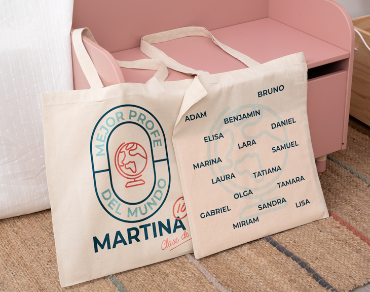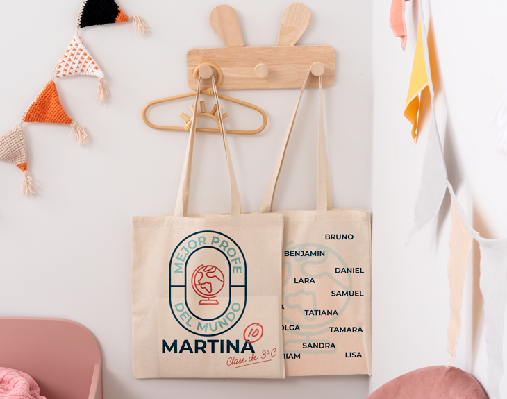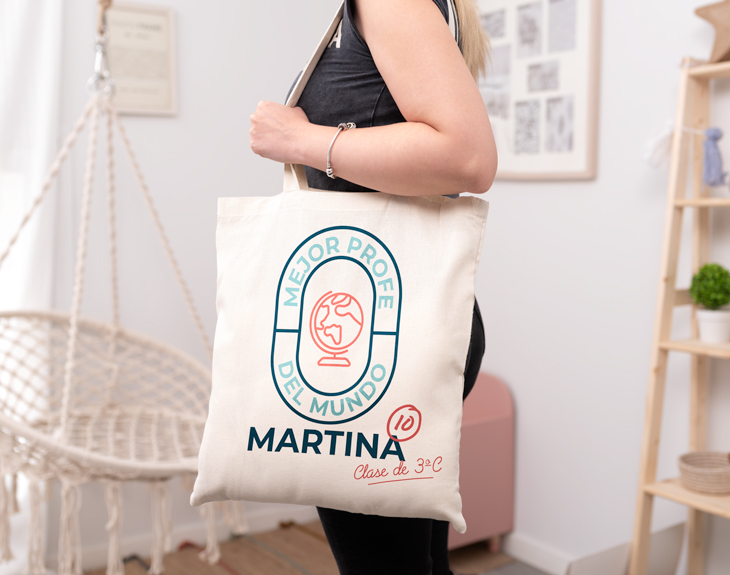 Todos estamos de acuerdo que si tienes el mejor profe del mundo se merece el mejor regalo del mundo y es: ¡nuestra bolsa tote personalizada! Y es que fin de curso es el momento perfecto para sorprender a nuestro profe con algún detalle para que se acuerde siempre de sus alumnos y así pueda llevar un trocito de su clase vaya donde vaya. Esta bolsa es perfecta y muy práctica para que cualquier profe pueda llevar a clase todas las cosas que necesita. ¡Se convertirá en su accesorio favorito! El último día de curso ha llegado y toca despedirse de nuestros amigos y profesores. Siempre da un poco de pena despedirse de ese profe que nos ha enseñado tanto y con tanta paciencia, y como agradecimiento es ideal regalarle esta original bolsa tote. Con un diseño hecho especialmente para todos los profes, con esta bolsa sabrá que para sus alumnos ha sido y es el mejor profe del mundo. Podrá utilizarla siempre que quiera y guardar todo lo que necesite. ¡Es la bolsa perfecta! Si una bolsa tote ya mola un montón, imagínate personalizar tu propia bolsa para profes. Añade el producto al carrito, entra en el área de personalización y comienza a crear tu diseño. Solo tendrás que rellenar los espacios vacíos con el nombre de tu profe y la clase que sois, así nunca se olvidará de los buenos momentos que habéis vivido. Esta bolsa de tela reutilizable, se convertirá en el mejor regalo para tu profe y no querrá parar de utilizarla.