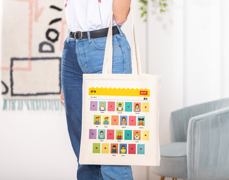 La mejor profe la historia necesita una regalo por todo lo que ha trabajado este año. ¡Lo ha dado todo en las clases de matemáticas, lengua o historia! Por eso esta bolsa tote personalizada será el detalle más práctico para él o ella, a la par que emocionante... ¡Y súper colorido! Y es que esta bolsa de tela con diseño de Lego no es como cualquier otro regalo para los maestros. ¡Es una orla con todos los niños de la clase en formato Lego! Podréis crear a todos sus alumnos y plasmarlos en una bolsa súper original, a elegir entre tres tipos distintos: natural, con asas a color o completamente colorida. Un regalo original para profesores como este seguro que le dejará con la boca abierta. ¡Verá una orla repleta de personajes Lego! Solo tendrás que añadir la bolsa al carrito y entrar en el área de personalización. Escoge el tipo de bolsa que quieres y entra en el diseñador, donde tendrás 30 casillas en las que personalizar a los alumnos que sea. ¡Ordénalo y diséñalo a tu gusto para que quede perfecto! Personalizar esta bolsa de tela es súper sencillo. El primer paso a seguir es añadir el producto al carrito y entrar al área de personalización. Una vez ahí, podrás diseñar desde cero tu avatar Lego, ¡ya verás qué divertido! Importante: Los huecos en los que no aparezca un personaje se incluirá un corazón.