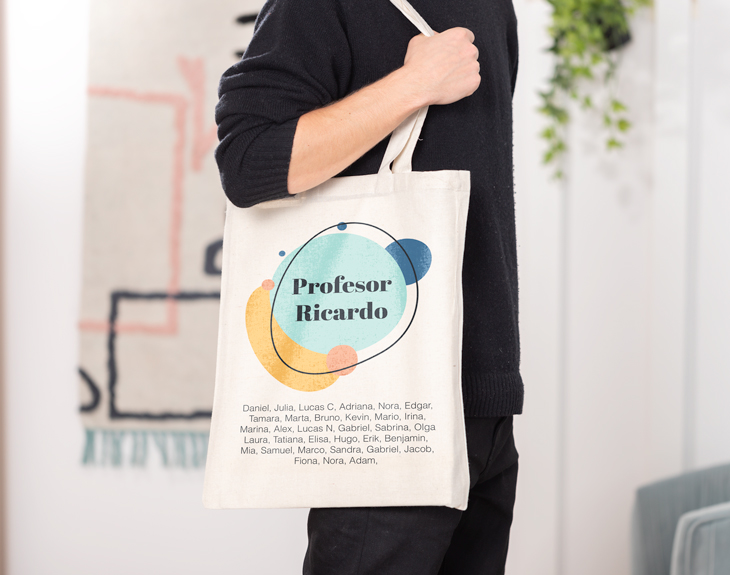 Los profesores tienen un poder, pueden conseguir que sus alumnos disfruten de su asignatura y que aprendan montón. Si este año habéis tenido una gran suerte con vuestro tutor, ahora que llega fin de curso está claro que tenéis que hacerle el mejor regalo del mundo. Y nuestra bolsa tote personalizada con diseño "Shapes" es el detalle perfecto de despedida. Es una preciosa forma de demostrarle lo mucho que lo queréis y de agradecerle lo mucho que habéis aprendido. Imagina la ilusión que le hará recibir este regalo tan original por parte de sus alumnos favoritos, le encantará. Y lo más especial de todo es que es personalizable, podrás escribir el nombre de vuestro profe junto con los nombres de todos los compañeros de la clase. ¡Nunca se olvidará de su clase favorita! Personalizar esta bolsa tote es súper sencillo. El primer paso a seguir consiste en añadir el producto al carrito y entrar al área de personalización. Una vez ahí, ya puedes escribir todos los nombres de la clase. Pronto estará perfecto y listo para regalar. ¡Será un original regalo para profesores!