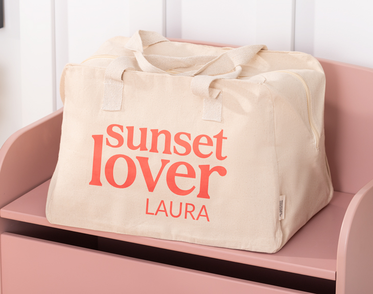 • Bolsa de viaje beige personalizada. • Tarjeta recordatoria.