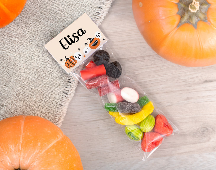 ¿Estás pensando en celebrar una súper fiesta de Halloween? Entonces estas bolsitas de chuches personalizadas no pueden faltar. Son ideales para sorprender a todos tus invitados y dar ese toque dulce que toda celebración tiene que tener. ¡Su diseño es lo más! Si quieres triunfar el día más terrorífico del año, no dudes que con estas originales bolsitas con diseño de calabazas y fantasmitas lo harás. Dentro de ellas encontrarás un deliciosa surtido de chuches que no dejarán indiferente a nadie, porque no podrán resistirse a comerse una tras otra. Y espera porque llega la mejor parte: ¡personalizar tus bolsitas de chuches! Gracias a nuestro selector de cantidad podrás elegir cuántas unidades quieres y si todas tendrán el mismo diseño o será diferentes. Una vez que accedas al diseñador, solo tendrás que escribir el texto que quieras y listo. ¡Nosotros nos encargamos del resto! Medidas: 22 x 7,5 centímetros. Peso: 125 gramos.