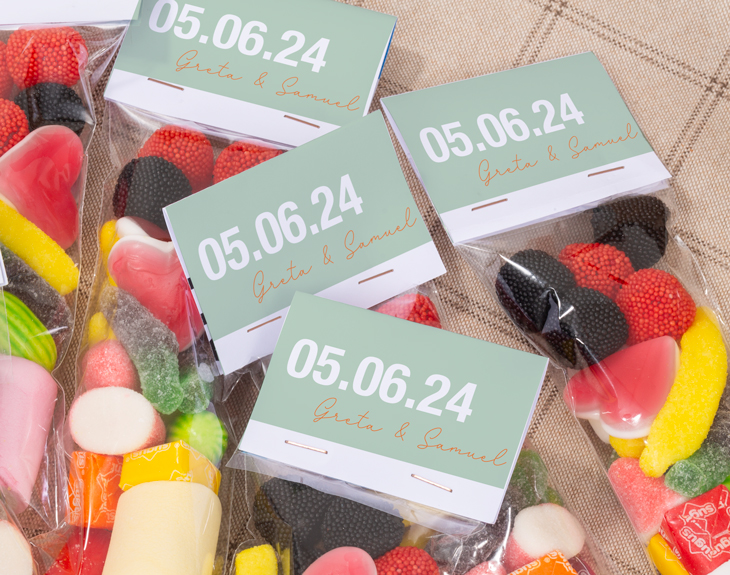 • Bolsita de chuches personalizada. • Tarjeta recordatoria.