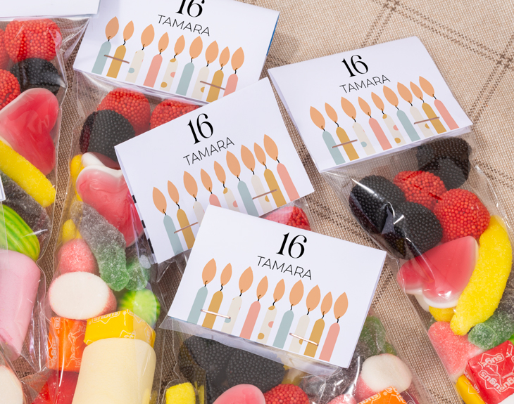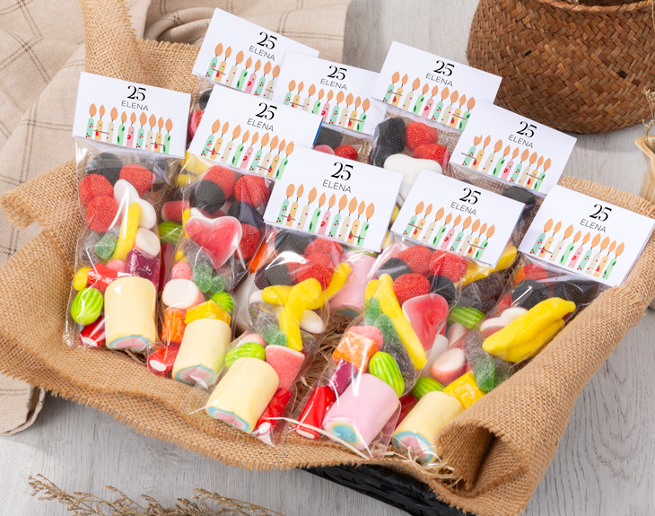 Un cumpleaños hay que celebrarlo por todo lo alto. Es una fecha en la que siempre nos acompañan nuestro amigos y familiares y nos hacen un montón de regalos. ¡Es genial! Si este año quieres hacer una fiesta de lo más especial, tenemos el detalle perfecto. Se trata de nuestras bolsita de chuches personalizada con diseño "Velitas", es ideal. Sin duda, es un regalito que hará inolvidable la fiesta de tu cumpleaños. ¡Es genial! Y es que está claro que las chuches endulzan a cualquiera. Pero lo mejor de todo es que es personalizable, podrás escribir el nombre que tú quieras. Es una forma de demostrar a todos tus amigos y seres queridos lo mucho que valoras su compañía, les encantará. Personalizar esta bolsita de chuches es súper sencillo. El primer paso a seguir consiste en añadir el producto al carrito y entrar al área de personalización. Una vez ahí, ya puedes escribir las iniciales del cumpleañero y la fecha de este día tan especial. Pronto estará perfecto y listo para regalar. ¡Será un original regalo para cumpleaños! Medidas: 22 x 7,5 centímetros. Peso: 125 gr.