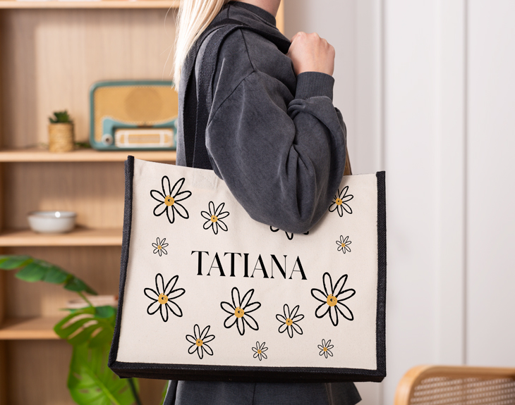 Llega el calorcito y con él las ganas de disfrutar de planes fuera de casa. Ya sea porque te vas de vacaciones o para pasar un día de picnic, nuestro bolso Capri personalizado Margaritas será tu mejor aliado para no olvidarte de nada. Gracias a su gran tamaño y a la resistencia de su tela, podrás guardar en él todo tipo de cosas, desde la toalla para tumbarte en la playa hasta el tupper de comida para pasar el día. Por otro lado, su precioso diseño personalizado lo convierten en todo un must para tu día a día, ¡Combinará con cualquier look! Este bolso de playa tiene un elegante acabado en tono beige natural con bordes de tela negra y unas largas y anchas asas negras, para que puedas llevarlo cómodamente contigo siempre que lo necesites. Sin embargo, lo que convierte en un auténtico tesoro a este bolso de verano es la posibilidad de personalizarlo con el nombre que prefieras. Entre un adorable campo de margaritas de varios tamaños, imprimiremos el nombre de esa persona tan especial para ti, haciendo de este bolso un regalo original ideal para sorprender a tus seres queridos. No dudes más y hazte con este bolso personalizado perfecto para aguantar tu ritmo todoterreno. Se convertirá en un complemento imprescindible para tu día a día y su amplitud te salvará de tener que ir siempre cargada con un montón de bolsas. Con tu nombre personalizado, ¡Serás la envidia de todos los que lo vean! Medidas: 39 x 32 x14 cm. Asas de mano de algodón (longitud: 73 cm).