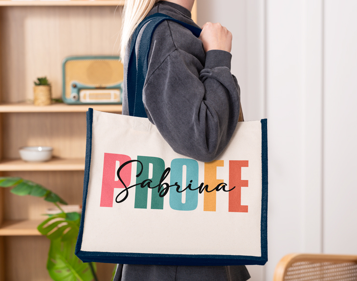 Un profe como el de tus hijos se merece un regalazo con la llegada del fin de curso. Y es que no hay nada como disfrutar del verano estando lo más liberado posible, desconectando del todo de la normalidad. ¡Gracias a este bolso personalizado podrá presumir de ser la profe más chula y querida del mundo mundial! ¿Dirías que la profe de tus hijos ha marcado un antes y un después en sus vidas? Recompénsala de la forma más colorida gracias a este bolso personalizado con diseño de colores, hecho de algodón y con unas medidas de 42 centímetros de largo por 33 centímetros de alto (¡y 19 centímetros de ancho). En su interior podrá llevar desde toallas para la playa hasta cualquier lectura en la que esté inmersa. Haz que el verano de la mejor maestra del mundo esté completo gracias a este regalo original para profes. Solo tendrás que añadir al carrito este producto para poder acceder al área de personalización, donde encontrareis el diseño de profe de colores. ¡Para personalizarlo solo tendrás que clicar sobre el cuadro de texto para escribir el nombre de esa profe tan especial! Medidas: 39 x 32 x14 cm. Asas de mano de algodón (longitud: 73 cm).
