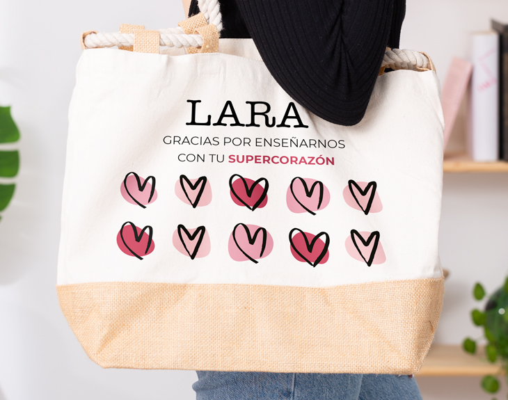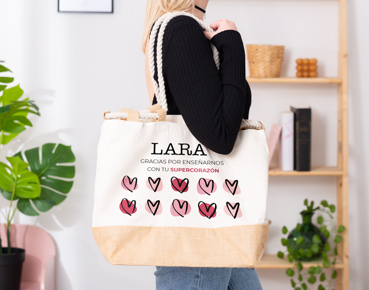 Esos profesores que enseñan desde el corazón y sienten mucha pasión por su trabajo y por enseñar a los demás, se merecen lo mejor del mundo. Si este año habéis tenido una profesora así de buena, está claro que tenéis que hacerle un regalo a su altura. ¡Nuestro bolso sailor personalizado con diseño "Corazones del profe" será el detalle perfecto! Además, ahora que las clases llegan a su fin es ideal como regalo de despedida. ¡Así nunca se olvidará de sus alumnos favoritos! Lo mejor es que es personalizable, podrás escribir el nombre de la mejor profe. Imagina la ilusión que le hará recibir este detalle tan bonito, se quedará sin palabras. Personalizar este bolso sailor es muy sencillo. El primer paso a seguir consiste en añadir el producto al carrito y entrar al área de personalización. Una vez ahí, ya puedes escribir el nombre del mejor profe del mundo. Pronto estará perfecta y lista para regalar. ¡Será un original regalo para profesores! Medidas sin asas: 50 x 34 x 17,5 cm. Medidas de las asas: 50 cm. Material: 100% algodón. Gramaje: 280 g/m².