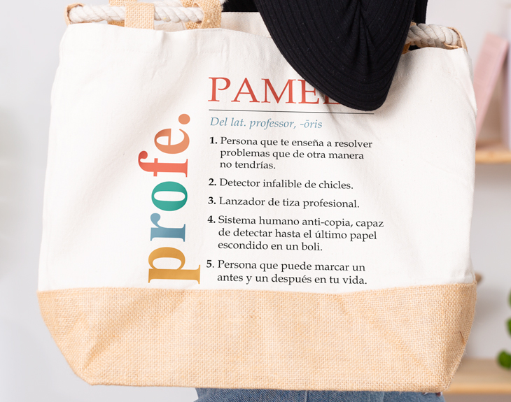 Hay profes que tienen la capacidad de marcar un antes y un después en la vida de sus alumnos. Esos profes que consiguen que todos aprendan y que a la vez disfruten durante las clases se merecen lo mejor. Si ahora que llega fin de curso, tenemos el mejor regalo para sorprender a ese profe tan especial, se trata de nuestro bolso sailor personalizado con diseño "Definición de profe de colores", le encantará. Además, ahora que se acerca el verano este bolso es perfecto para guardar todo lo necesario para los días de playa o piscina. Y lo más especial de este bolso es que es personalizable, podrás escribir el nombre del mejor profe del mundo. ¡Será súper especial! Así nunca se olvidará de su clase favorita. Personalizar este bolso sailor es muy sencillo. El primer paso a seguir consiste en añadir el producto al carrito y entrar al área de personalización. Una vez ahí, ya puedes escribir el nombre del mejor profe del mundo. Pronto estará perfecto y listo para regalar. ¡Será un original regalo para profesores! Medidas sin asas: 50 x 34 x 17,5 cm. Medidas de las asas: 50 cm. Material: 100% algodón. Gramaje: 280 g/m².
