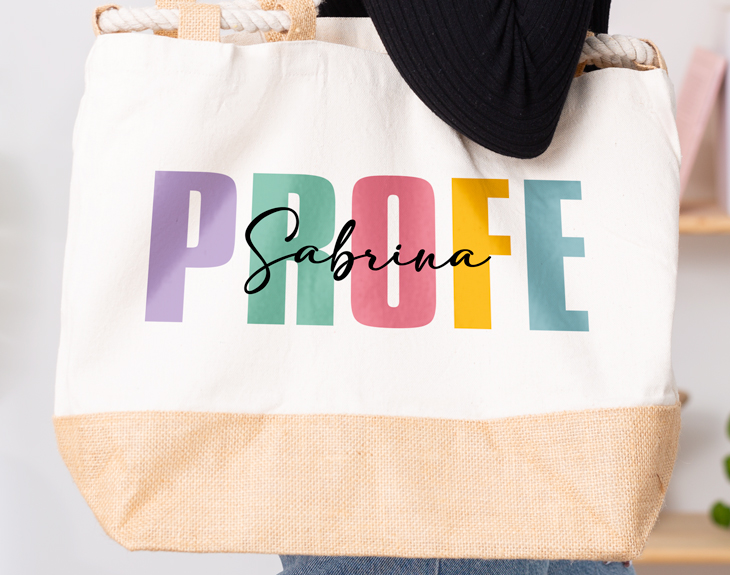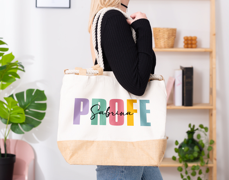 ¿Qué características tiene que tener el mejor profe del mundo? Sin duda, empatía, creatividad, dedicación pero, sobre todo, mucha paciencia, son cualidades que no le pueden faltar. Si vuestro profe cumple con todas, está claro que se merece un regalo a modo de agradecimiento por todo lo que os ha enseñado durante las clases. Nuestro bolso sailor personalizado con diseño "Profe colorines" es el regalo perfecto de despedida ahora que se terminan las clases. Porque es ideal para guardar todas las cosas de la piscina o la playa perfectas para sobre llevar el calor. Además, lo mejor es que es personalizable, podrás escribir el nombre del mejor profe del mundo. ¡Le encantará! Personalizar este bolso sailor es muy sencillo. El primer paso a seguir consiste en añadir el producto al carrito y entrar al área de personalización. Una vez ahí, ya puedes escribir el nombre del mejor profe del mundo. Pronto estará perfecta y lista para regalar. ¡Será un original regalo para profesores! Medidas sin asas: 50 x 34 x 17,5 cm. Medidas de las asas: 50 cm. Material: 100% algodón. Gramaje: 280 g/m².