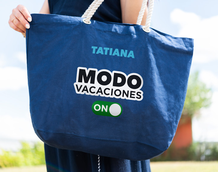 La playa es el mejor lugar del mundo, donde podemos pasar horas y horas y no cansarnos nunca. Podemos bañarnos en el mar, tumbarnos a tomar el sol en la arena, jugar a las cartas, leer un libro mientras escuchamos las olas... ¡Es un planazo! Pero para pasar los días en la playa, sabemos que hay que llevar muchas cosas y por eso necesitas este bolso personalizado. Estamos seguros de que se convertirá en tu accesorio favorito para este verano y que no pararás de utilizarlo todos los días. ¡Es genial! El verano es el mejor momento para hacer todos esos planes que no hemos podido hacer durante el resto del año y uno de ellos es disfrutar de la playa. Y es que no hay mejor complemento para esos días que nuestro original bolso veraniego. Ideal para ser tu mejor aliado cada vez que vayas a la playa o la piscina y poder llevar todas las cositas que necesites para que tu día sea perfecto. Si quieres saber cómo personalizar este bolso sigue leyendo porque es muy fácil. - Si eliges personalizar solo el exterior: completa este divertido diseño con el nombre que quieras y listo. - Si eliges personalizar el exterior y el interior: en el caso del exterior, solo tendrás que completar el diseño. En el interior, podrás elegir qué opción te gusta más y completarla también con el nombre o texto que quieras. Medidas sin asas: 55 x 39 x 15 cm. Medias de las asas: 90 cm. Material: lona. Gramaje: 220 g/m².