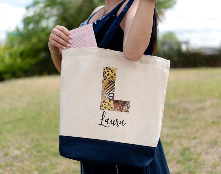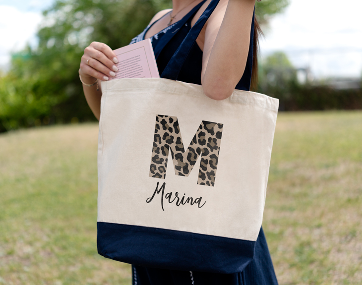 Normalmente, cuando vamos a pasar un día entero fuera de casa, queremos ir bien preparados y llevamos un montón de cosas. Para eso, ¡nuestro veraniego bolso Sicilia es ideal! ¡Cabe de todo! Podrás guardar todas las pertenencias que necesites como agua, crema solar, bikinis, toallas… Es perfecto porque se amolda a cualquier actividad y te lo puedes llevar a todas partes, te acompañará en tus aventuras diarias. Para ir a la playa, piscina o alguna excursión. Además, puede ser un regalo único y original, que se puede personalizar con el nombre y la inicial en un estampado Animal Print ¡Seguro que le encanta a cualquier persona! Para personalizarlo podrás elegir entre varias opciones de diseño. La bolsa tiene el asa azul a juego con franja de abajo. La inicial con el estampado en animal print, sin duda, le dará un toque más salvaje. Podrás escoger el relleno que más te guste. Además, puedes colocar el nombre en el exterior justo debajo de la inicial o bien en el interior de la bolsa. - Si eliges personalizar solo el exterior: solo tendrás que completar el diseño que te dejamos y listo. - Si eliges personalizar el exterior y el interior: en el caso del exterior, solo tendrás que completar el diseño. En el interior, podrás elegir qué diseño te gusta más y completarlo también con el nombre o texto que quieras. Medidas: 46,5 x 40 x 15 cm. Medidas del bolsillo delantero: 22 x 18 cm. Medidas de las asas: 66 cm. Material: lona. Gramaje: 280 g/m².