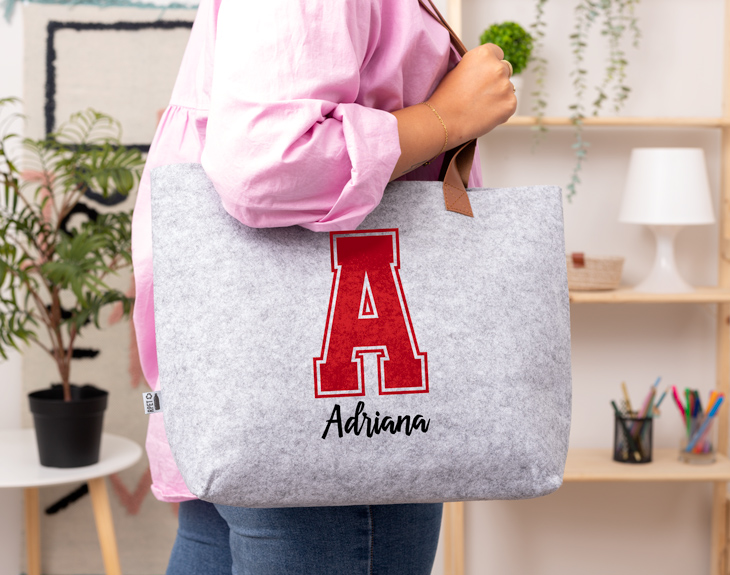 Si eres de esas personas que por motivos de la vida tiene que pasar mucho tiempo fuera de casa, continúa leyendo. Este bolso Stone es algo que no te puede faltar. Es perfecto para que puedas llevar todas tus pertenencias allá donde vayas, te permitirá llevar todo lo necesario a cualquier sitio. También es ideal si conoces a esa persona que siempre lleva de todo en el bolso, sin duda, es un regalo único y original. ¡A cualquiera le encantará tener su propio bolso personalizado! El diseño del bolso tiene una inicial en grande que pertenece a nuestro alfabeto College, inspirado en las letras de los clubes estudiantiles de EEUU. Debajo de la letra va colocado un nombre o un mensaje. ¡La inicial y el nombre los eliges tú! Este bolso está fabricado con fieltro RPET de color gris, es la combinación de materiales plásticos reciclados. Mientras tanto las asas son de polipiel en un tono más marrón. Además de ser un complemento práctico es sostenible y bueno para el medioambiente. ¡No esperes más y hazte con este bolso Stone! Personalizar este bolso Stone con alfabeto College es algo muy sencillo. Lo primero que tienes que hacer es añadir el producto al carrito y entrar al área de personalización. Una vez ahí, escoges la inicial o el número que quieras poner en el bolso, y a continuación escribes el nombre o mensaje. ¡Nosotros nos encargamos de que quede perfecto! Altura: 65 centímetros (con asas incluidas) y 30 centímetros (sin asas incluidas). Largo: 42 cm. Material: fieltro RPET/Polipiel. Resistencia de hasta 6 kilogramos.