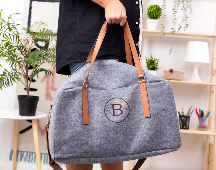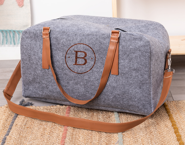 Haz de tus viajes algo único y cómodo. Con este bolso de viaje, recorrer el mundo se convertirá en algo más ameno y cómodo. Es ideal para llevar todas esas prendas que tanto te gustan. Tendrás sitio para guardar todas las cosas imprescindibles para evitar los imprevistos. ¡No esperes más y hazte con esta bolsa de viaje! También es un regalo perfecto para esa persona aventurera que siempre está de un lado para otro. El diseño de esta bolsa de viaje lleva una inicial en el centro, rodeada con un círculo, todo ello en color marrón. Está fabricado con fieltro RPET, es la combinación de materiales plásticos reciclados. Además, cuenta con cuatro asas de polipiel de color marrón, así puedes elegir entre llevarla colgada al hombro o agarrada con la mano, como más cómodo te resulte. Y te preguntarás… ¿cómo se personaliza esta bolsa de viaje? El primer paso a seguir, es añadir el producto al carrito y entrar al área de personalización. Una vez ahí, escoges las iniciales que quieres que aparezcan y nosotros nos encargamos del resto. Altura: 30 centímetros. Ancho: 35 centímetros. Largo: 50 centímetros. Material: fieltro RPET/Polipiel.