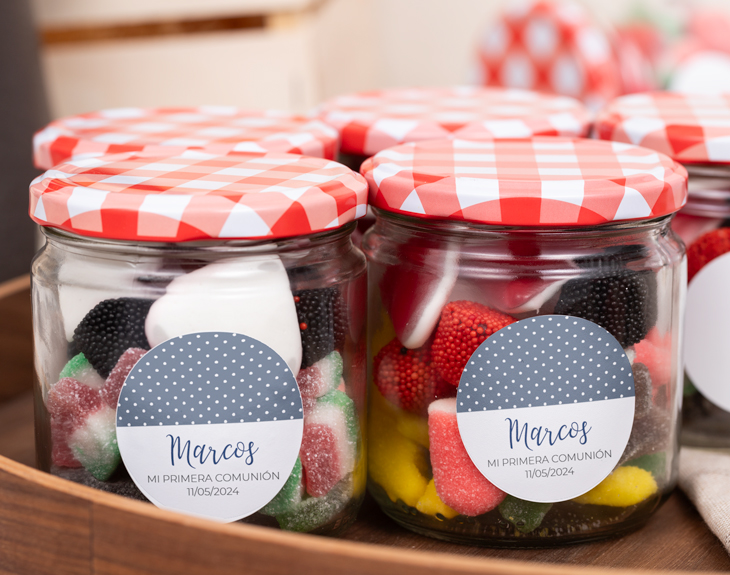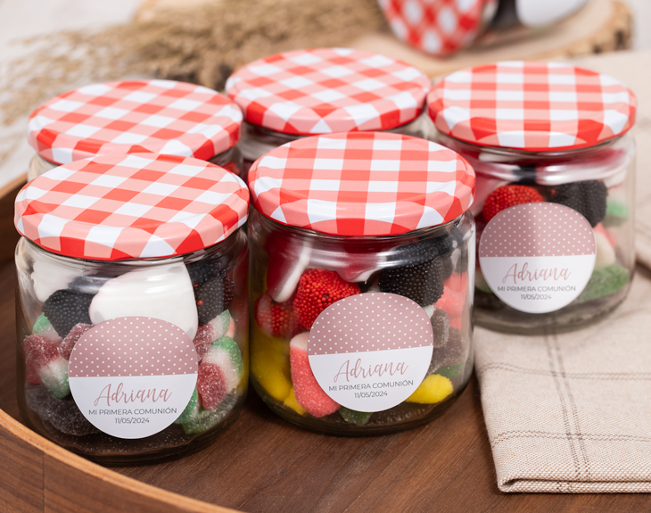La Primera Comunión es una fecha muy especial en la infancia de cualquier niño. Marca un antes y un después en su vida religiosa. Además, en esta fecha se reúnen todos los seres queridos y amigos de la familia del niño para acompañarlo en este día tan bonito. Por eso, tiene que salir perfecto. ¿Acaso hay algo que guste más a los peques que las chuches? ¡Está claro que no! Por eso, si quieres sorprender a los invitados de la comunión, nuestro bote de chuches personalizado con diseño "Lunares de comunión" será el recuerdo perfecto de este día tan especial. Y lo mejor es que es personalizable. ¡Podrás escribir lo que tú quieras en esta pegatina tan chula! Personalizar este bote de chuches es muy sencillo. El primer paso a seguir consiste en añadir el producto al carrito y entrar al área de personalización. Una vez ahí, ya puedes escribir el nombre del protagonista de la comunión, el lugar y la fechas del evento. Pronto estará perfecto y listo para regalar. ¡Será un original regalo para comuniones Medidas del bote: Altura: 8,5 cm. Diámetro: 8 cm. Importante: si puedes tener reacción a cualquier tipo de alérgenos, puedes escribirnos para consultar si hay alguna opción alternativa.