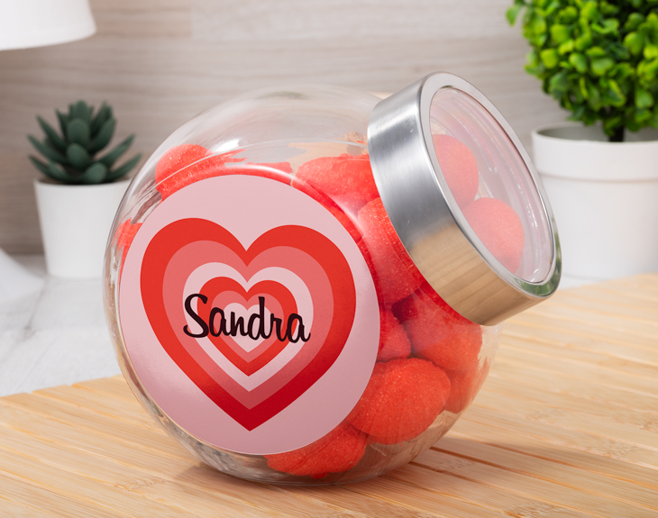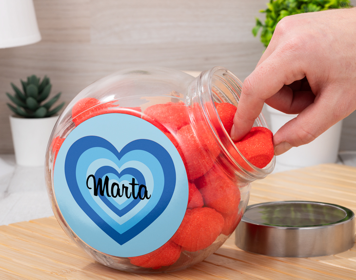Estar enamorado es un sentimiento único y que hace palpitar nuestro corazón en todo momento. Si te consideras un afortunado por la persona que tienes a tu lado y quieres sorprenderla con un detallito muy dulce y especial, no dudes que nuestro bote de cristal personalizado es justo lo que necesitas. Si a tu pareja y a ti os encanta disfrutar de vuestros dulces favoritos, este regalo os encantará. Este original regalo es perfecto para triunfar el día más romántico del año, el 14 de febrero, con esa persona que tanto quieres. Pero sin duda lo mejor de todo es que podrás elegir si quieres únicamente el bote personalizado o si quieres añadir a su interior estas chuches en forma de corazón. ¡Es el regalo perfecto para los más golosos! Pero espera porque todavía tienes que personalizar este bote de cristal para que sea único y muy especial. Añade el producto al carrito y entra en el área de personalización. Ahí solo tendrás que personalizar esta pegatina tan guay que irá en uno de los lados del bote, con el nombre que quieras y listo. Tendrás el regalo más dulce del mundo para conquistar a tu amorcito. Medidas: 19 x 16 centímetros. Importante: La tapa del bote puede variar según stock.