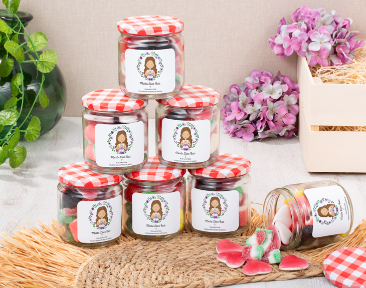 • Bote de chuches personalizado. • Tarjeta Recordatoria.