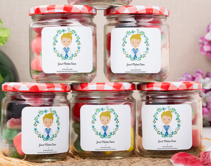 ¿Buscas sorprender a los invitados de la Primera Comunión del peque de la casa? ¡Tenemos el detalle perfecto! Se trata de nuestro bote de chuches personalizado con diseño "Flores de comunión", sin duda, es perfecto para una ocasión así. ¡Será un recuerdo muy especial de esta ceremonia! Y es que las chuches siempre son un acierto para cualquier ocasión. ¡Endulzan a cualquiera! Lo mejor de este bote es que es personalizable. Podrás escribir lo que tú quieras en esta pegatina tan chula, como por ejemplo, el nombre del protagonista de la comunión, el lugar de la ceremonia y la fechas. ¡Quedará un recuerdo de lo más especial! Personalizar este bote de chuches es muy sencillo. El primer paso a seguir consiste en añadir el producto al carrito y entrar al área de personalización. Una vez ahí, ya puedes escribir lo que tú quieras. Pronto estará perfecto y listo para regalar. ¡Será un original regalo para comuniones! Medidas del bote: Altura: 8,5 cm. Diámetro: 8 cm. Importante: si puedes tener reacción a cualquier tipo de alérgenos, puedes escribirnos para consultar si hay alguna opción alternativa.