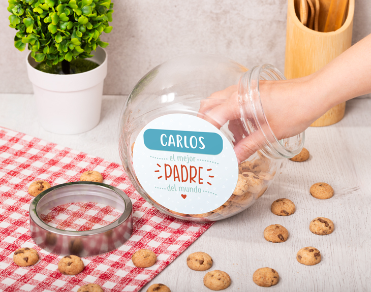 ¿Tienes al mejor padre del mundo pero tienes poco tiempo para decírselo? Si tu papá pasa demasiado tiempo trabajando y apenas os veis, este bote de cristal personalizado siempre le recordará lo mucho que le quieres. Porque seguramente ha hecho muchas cosas por ti: enseñarte a montar en bicicleta, responder a todas tus curiosidades o darte una buena educación. Ya va siendo hora de que le digas lo importante que es tu vida. Este bote de cristal personalizado con el nombre del mejor padre del mundo está hecho de cristal y tiene unas dimensiones de 16 centímetros de alto por 19 de ancho. Además, dispone de un sistema de cierre sencillo con una tapa de plástico. ¡Perfecto para que no se pierda absolutamente nada! En su interior caben un buen número de galletas y es fácil llevárselo de un lado a otro. Imagínate que tu padre hace una pausa en el trabajo para almorzar unas deliciosas cookies y sonríe al ver este regalo original, que le recuerda lo buen padre que es y lo orgullosos que están sus hijos de él. Con este regalo dejarás a tu padre boquiabierto el Día del Padre, por su cumpleaños o en el momento que menos se lo espere. Para ello solo tienes que añadir el artículo al carrito y escribir su nombre. Y nosotros ya nos encargaremos de ponerlo junto a la frase del mejor padre del mundo en el bote de cristal. ¿A qué esperas para ponerte al día con tu papá? Gracias a este bote podréis compartir vuestras galletas favoritas mientras pasáis una tarde de pelis en casa. ¡Verás cómo disfrutáis de pasar tiempo juntos! Medidas: 19 x 16 centímetros. Importante: La tapa del bote puede variar según stock.